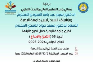 Under the patronage of the President of the University of Basrah, Professor Dr. Muhannad Jawad Kazem, and a number of official figures, led by the Governor of Basra, Engineer Asaad Al-Eidani, a ceremony was held to honor the professors and employees, and in the presence of the Dean of the College of Education for Pure Sciences, Professor Dr. Majid Muhammad Jassim.