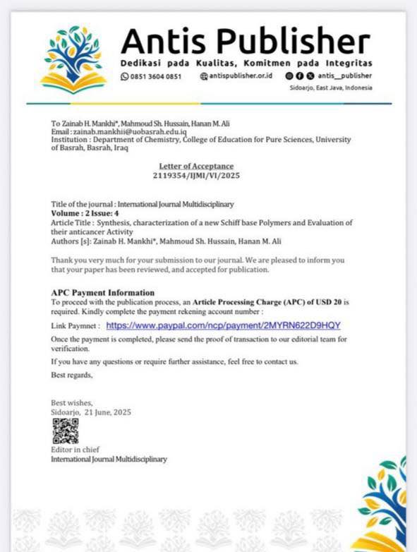A research team from the College of Education for Pure Sciences/Department of Chemistry published a scientific paper in the Indonesian International Journal. The team consisted of professors and master's students: