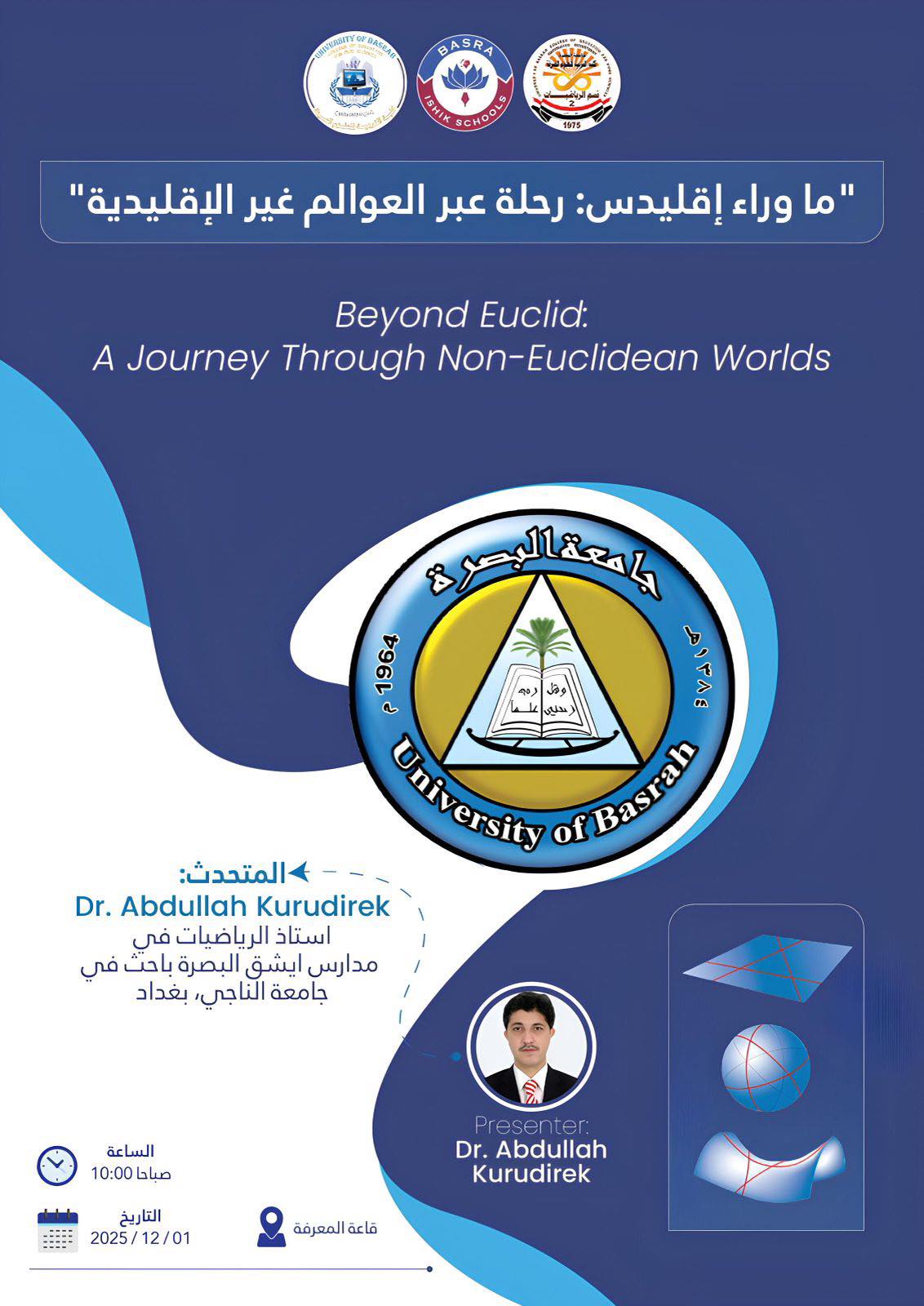 “Beyond Euclid: A Journey Through Non-Euclidean Worlds.” The seminar will be presented by Dr. Abdullah Kurdwerk from Turkey, a mathematics professor at Ishik International Schools. Dr. Kurdwerk possesses expertise in educational research in Euclidean and non-Euclidean geometry, in addition to his experience in the educational process for mathematics teachers in Iraqi and international schools.