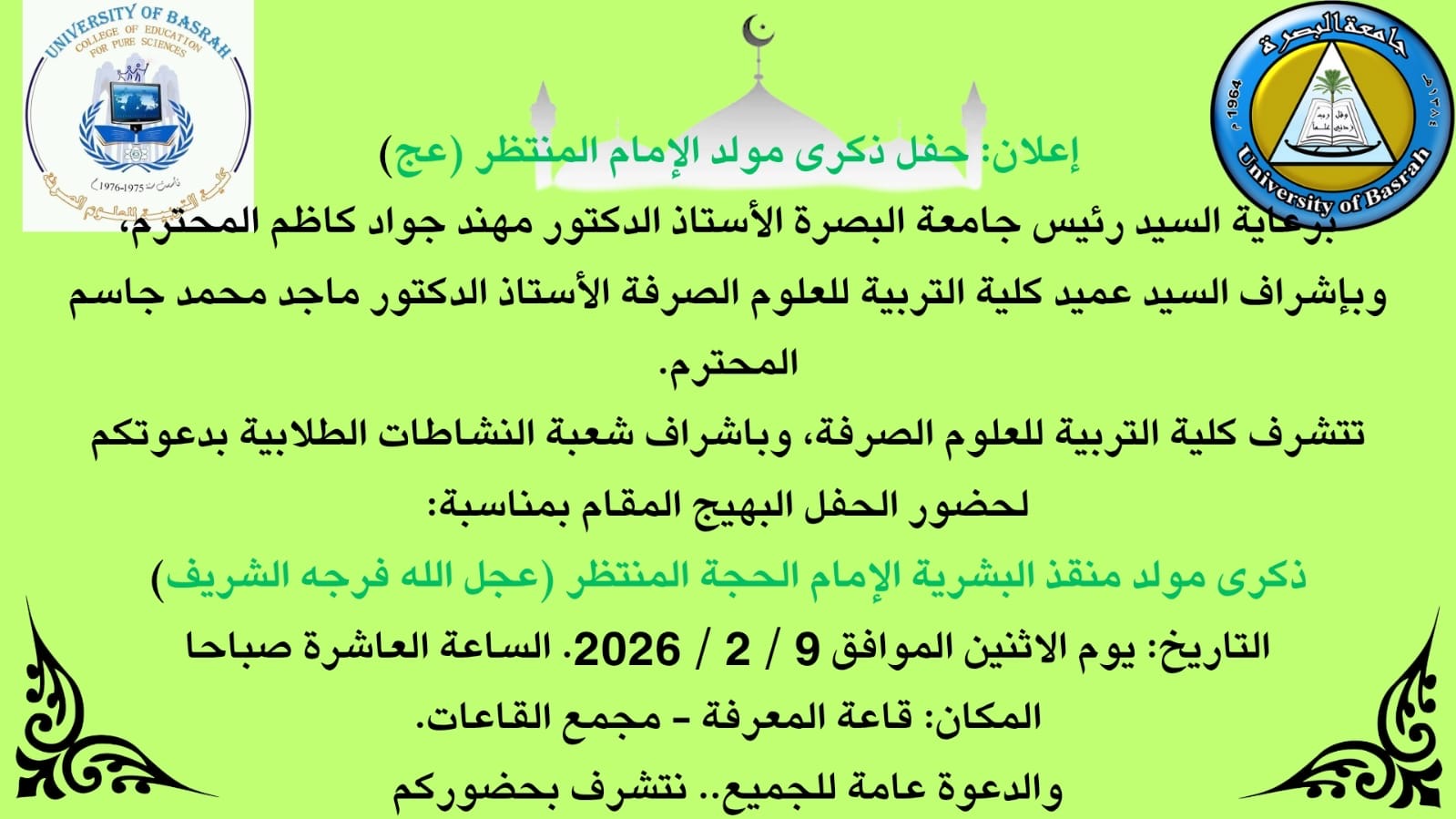 The College of Education for Pure Sciences holds a ceremony to commemorate the birth anniversary of Imam Al-Hujjah Al-Muntazar (may God hasten his reappearance).
