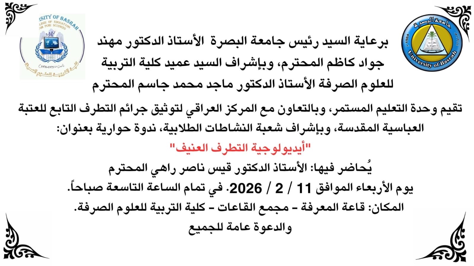 The College of Education for Pure Sciences is holding a dialogue seminar entitled (The Ideology of Violent Extremism)