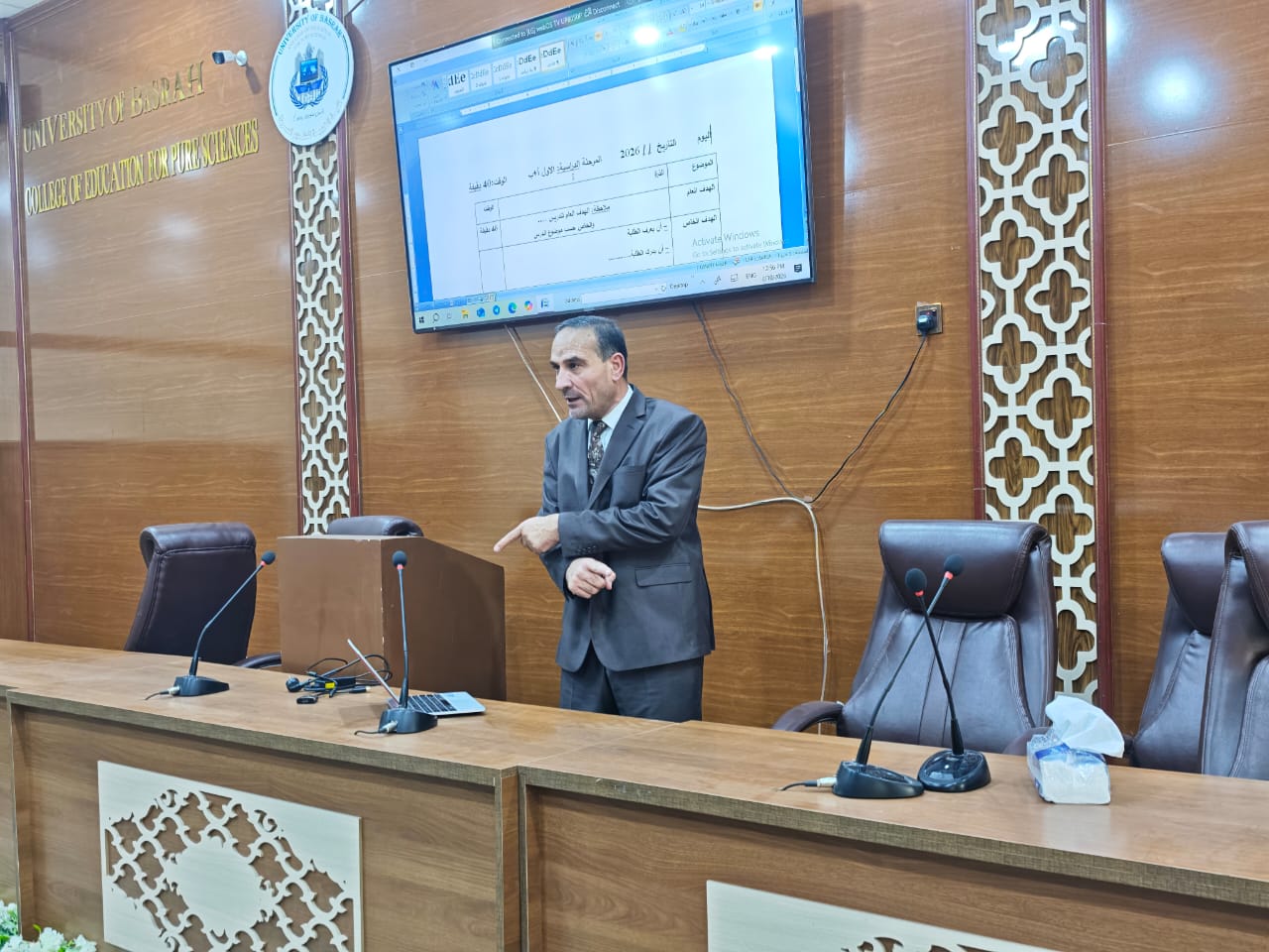 The Educational Guidance Unit at the College of Education for Pure Sciences, in cooperation with the Department of Mathematics, held a workshop entitled "The Needs of the Student Teacher in Mathematics." The workshop was presented by Dr. Khalid Abdul-Ilah, Dr. Zainab Jamil (Director of the Educational Guidance Unit), and Dr. Salman Dawood (from the Directorate of Education). Several guidance topics were addressed, most notably: effective classroom management techniques, the process of writing lesson plans, and the fundamentals of teaching mathematics.
